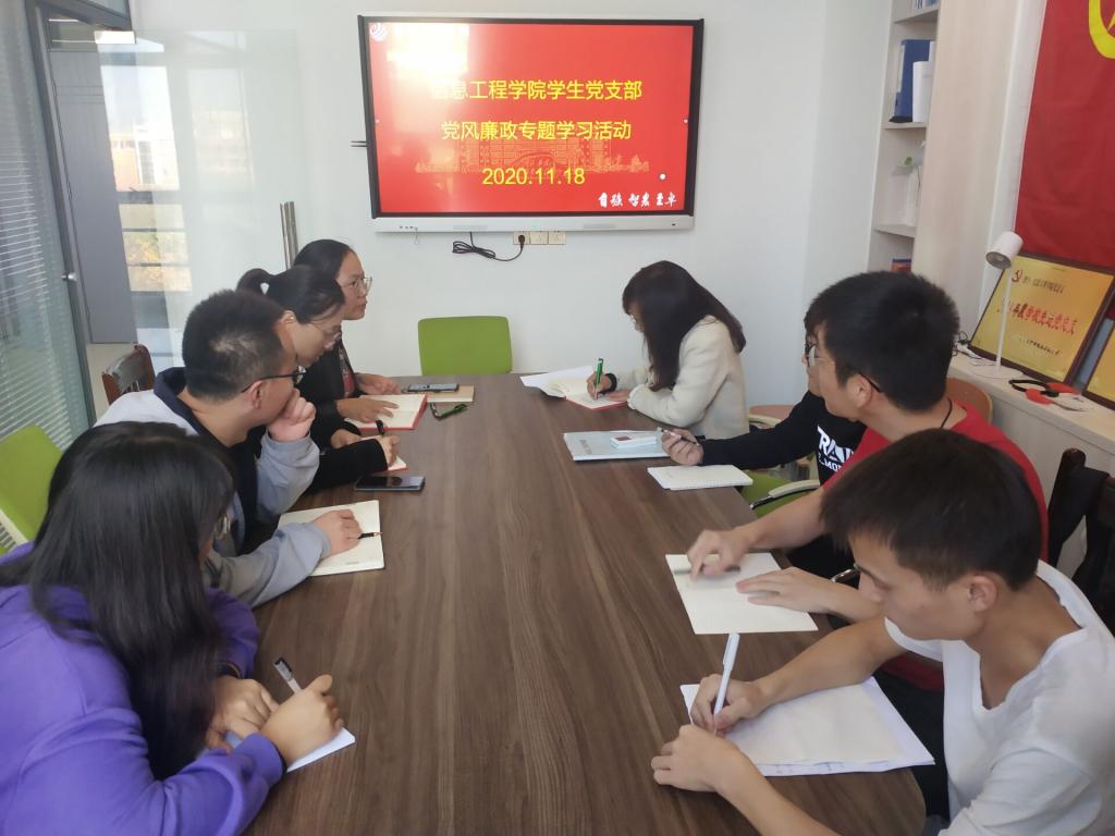 为增强党员的廉政教育,11月18日下午1:30信息工程学院学生党支部在工科楼B401开展党风廉政专题学习活动。本次学习主要内容:学习《中华人民共和国公职人员政务处分法》和观看警示教育片。