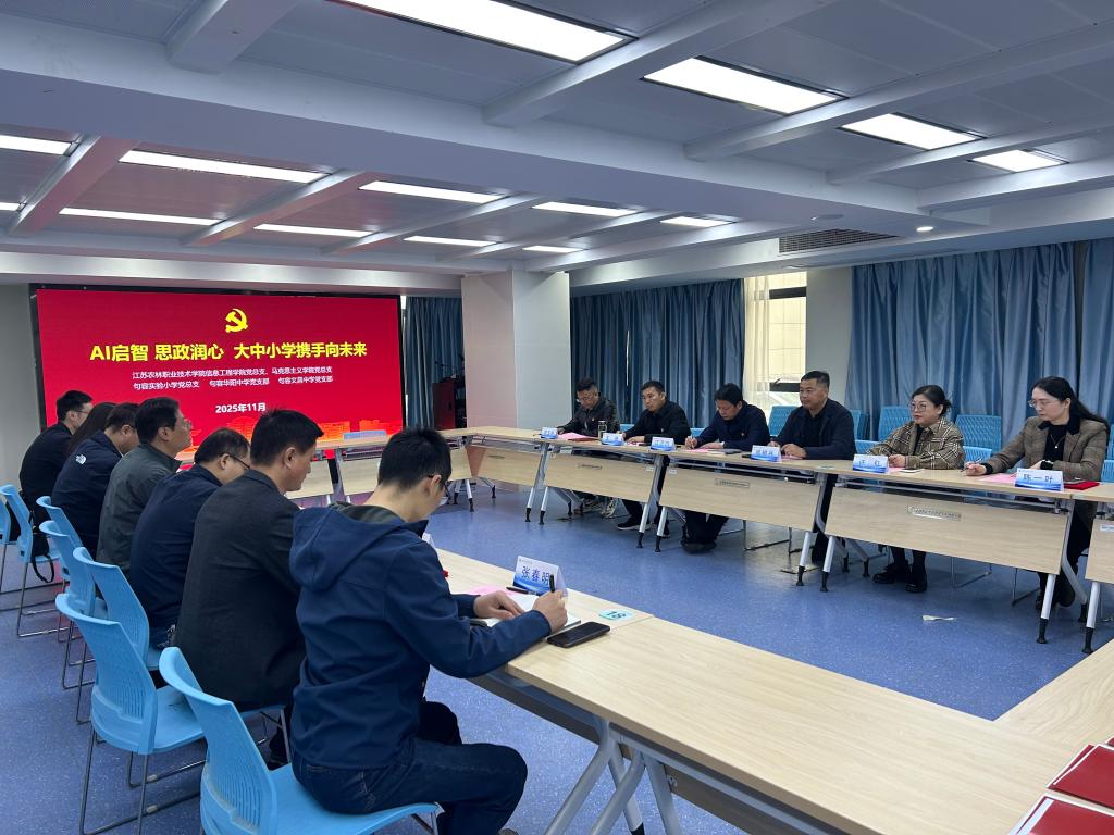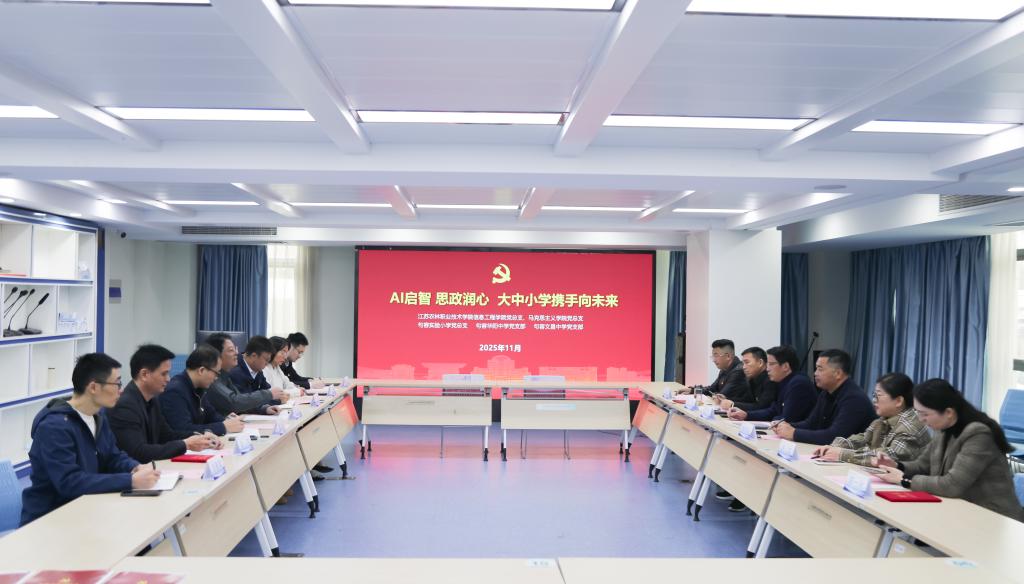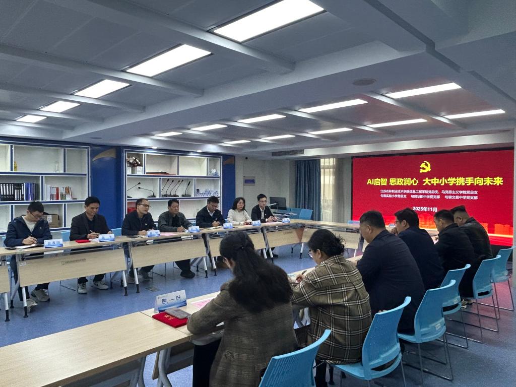 11月6日上午,信息工程学院党总支和马克思主义学院党总支携手句容市实验小学、华阳中学和文昌中学开展主题为“AI启智 思政润心 大中小学携手向未来”的大中小学党建共建活动。信息工程学院党总支书记经松,马克思主义学院党总支副书记、院长唐智,学院党委组织部副部长王涛,句容市实验小学党总支书记许红,华阳中学党支部书记、校长江卫巧,文昌中学党支部书记、校长王进等中小学领导参加了此次党建共建活动。