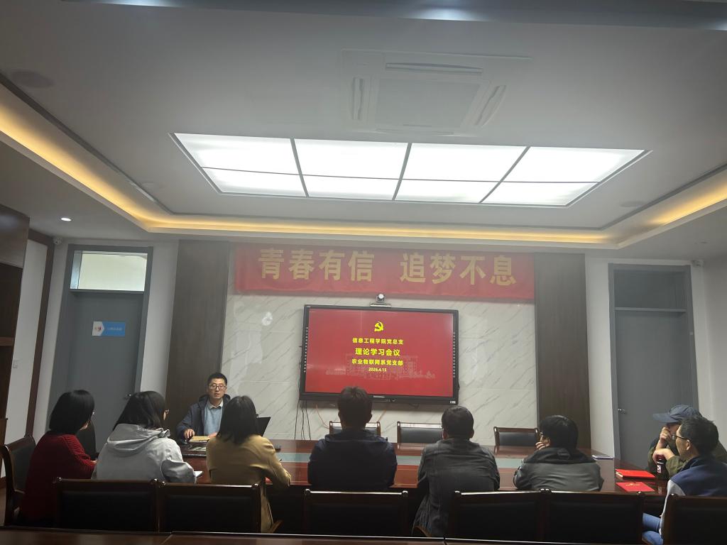 4月15日,信息工程学院农业物联网系党支部在G-B404组织开展政治理论学习,此次学习会议由支部书记崔明主持。学习内容为习近平总书记在参加十四届全国人大四次会议江苏代表团审议时的重要讲话精神和习近平总书记2023年7月考察江苏时强调的“三个坚持、三个不”重要论述。